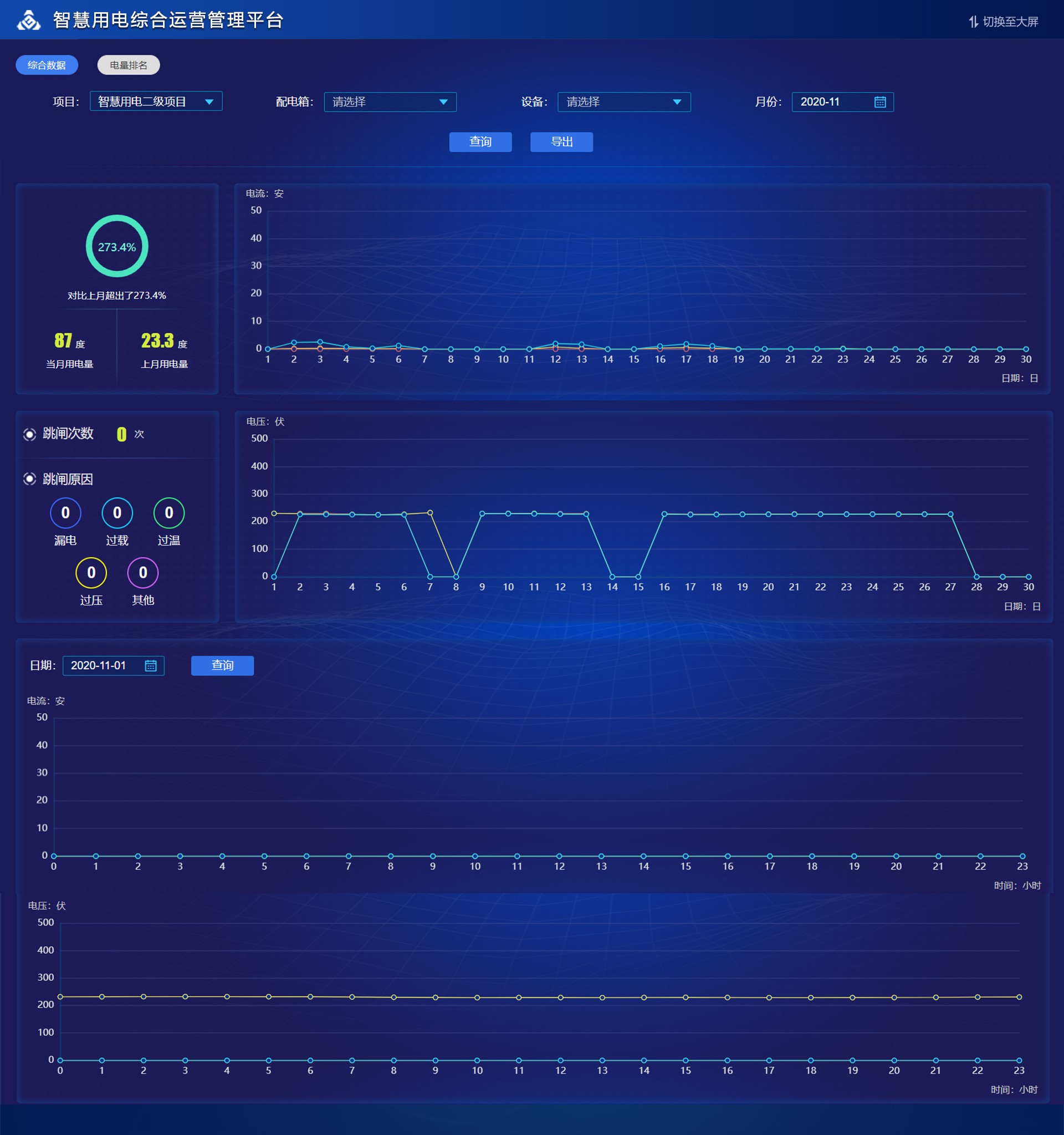 展示設備線路的電流,電壓,功率,溫度走勢圖。